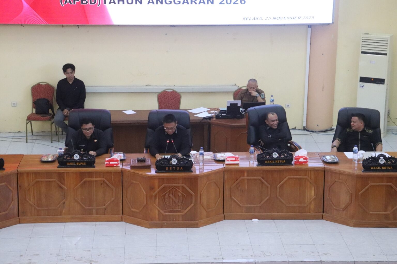 Rapat yang digelar bertempat di ruang paripurna DPRD Bolmong tersebut dipimpin langsung oleh Ketua DPRD Tonny Tumbelaka di dampingi Wakil Ketua DPRD Febrianto Tangahu, dan Sulhan Manggabarani, dan dihadiri Wakil Bupati Bolmong, Dony Lumenta beserta jajaran Organisasi Perangkat Daerah (OPD) di lingkungan Pemkab Bolmong.