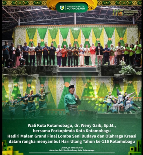 BOGANINEWS, KOTAMOBAGU – Semarak perayaan HUT Kotamobagu yang ke-116 Tahun, Wali Kota Kotamobagu, Weny Gaib, menghadiri malam puncak Final Lomba Dana-dana, Line Dance dan ‘Pantun Salamat’, yang digelar di Alun-alun Boki Hontinimbang Kotamobagu, Jumat (16/1/2026).