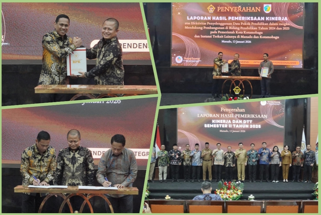 BOGANINEWS, KOTAMOBAGU – Wali Kota Kotamobagu Bapak dr. Weny Gaib, Sp.M., didampingi Ketua Komisi II DPRD Kota Kotamobagu Bapak Dani Ikbal Mokoginta, S.H. Menerima Laporan Hasil Pemeriksaan Kinerja (LHPK) atas Efektivitas Penyelenggaraan Data Pokok Pendidikan dalam rangka mendukung pembangunan di bidang Pendidikan Tahun 2024 dan 2025, pada Pemerintah Kota Kotamobagu. Bertempat di Kantor BPK-RI Perwakilan Sulawesi Utara (Sulut) Manado, Selasa, 13 Januari 2026.