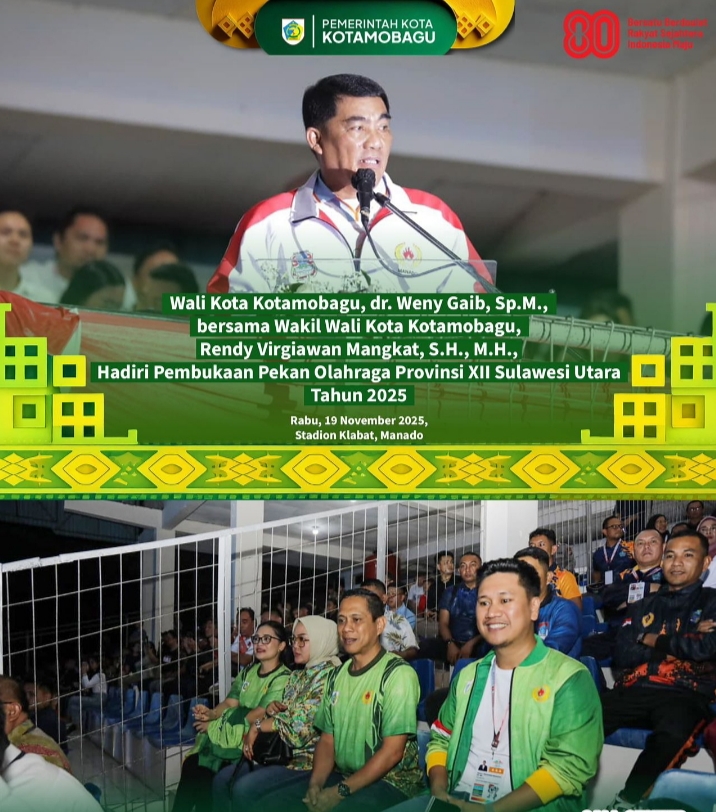 BOGANINEWS, KOTAMOBAGU – Wali Kota Kotamobagu, dr. Weny Gaib, Sp.M., bersama Wakil Wali Kota Kotamobagu, Rendy Virgiawan Mangkat, S.H., M.H., Hadiri Pembukaan Pekan Olahraga Provinsi (Porprov) XII Sulawesi Utara, bertempat di Stadion Klabat, Manado, pada Rabu 19 November 2025.